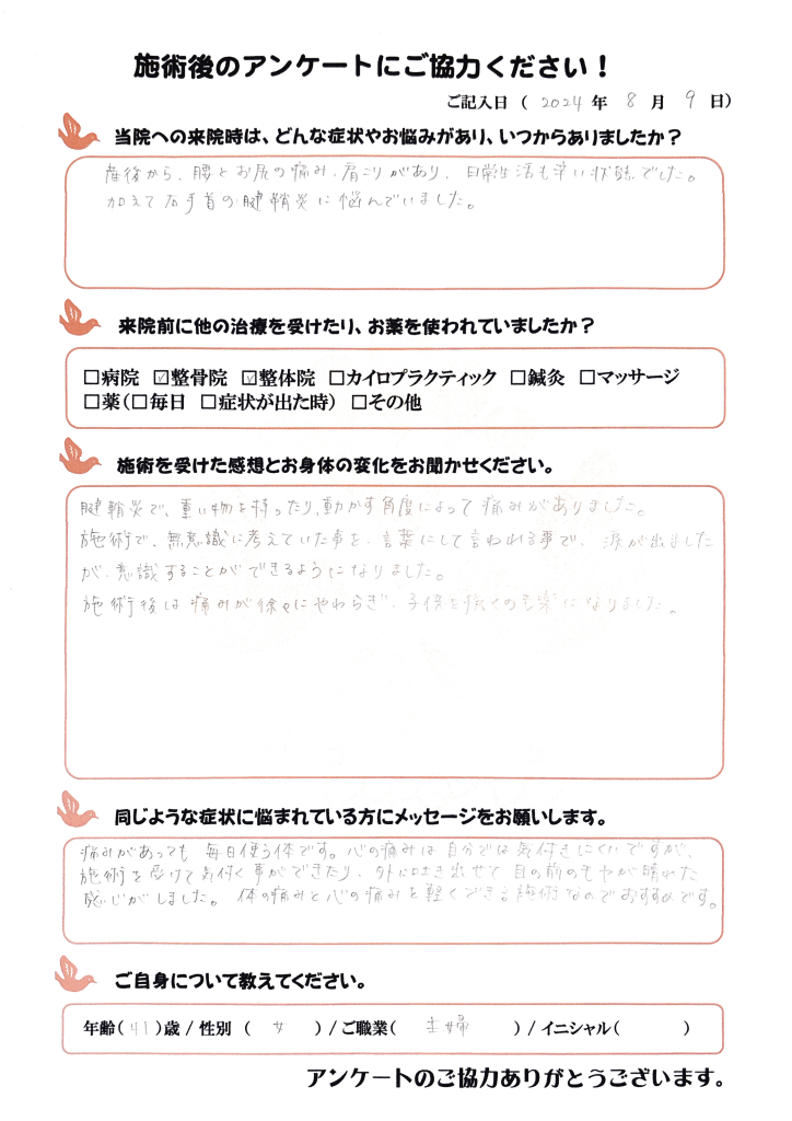 産後から腰とお尻の痛み、肩こりがあり、日常生活も辛い状態でした。